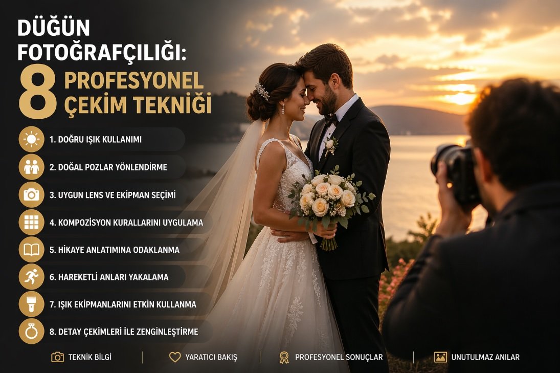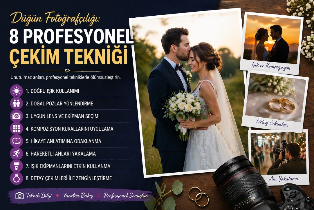 profesyonel ve etkileyici kareler elde etmek isteyenler için büyük önem taşır. Doğru ışık kullanımı, kompozisyon bilgisi ve anı yakalama becerisi, başarılı bir düğün çekiminin temelini oluşturur. Bu rehberde, hem yeni başlayanlar hem de kendini geliştirmek isteyenler için en etkili yöntemleri detaylı şekilde ele alıyoruz.